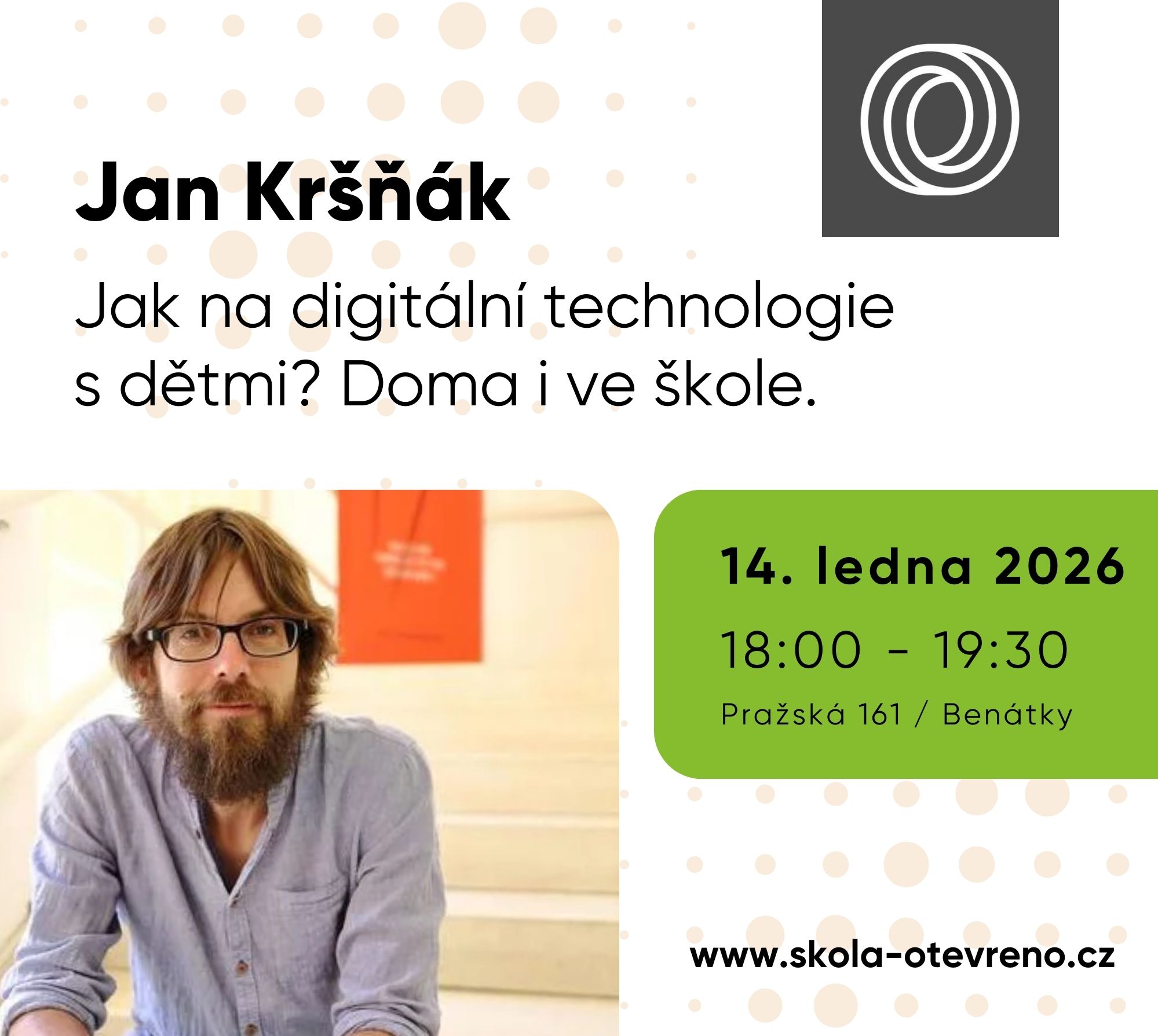 Zveme vás na setkání s Janem Kršňákem (digideti.cz), který se věnuje digitálním technologiím v kontextu výchovy a vzdělávání.